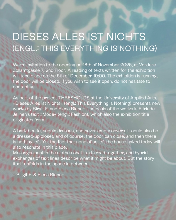 Dieses Alles ist Nichts präsentiert in diesem Rahmen neue Arbeiten von Birgit F. und Elena Riener, die eigens für diese Ausstellung entstanden sind. Ausgangspunkt ist Elfriede Jelineks Text Mode, von dem auch der Titel der Arbeit stammt.