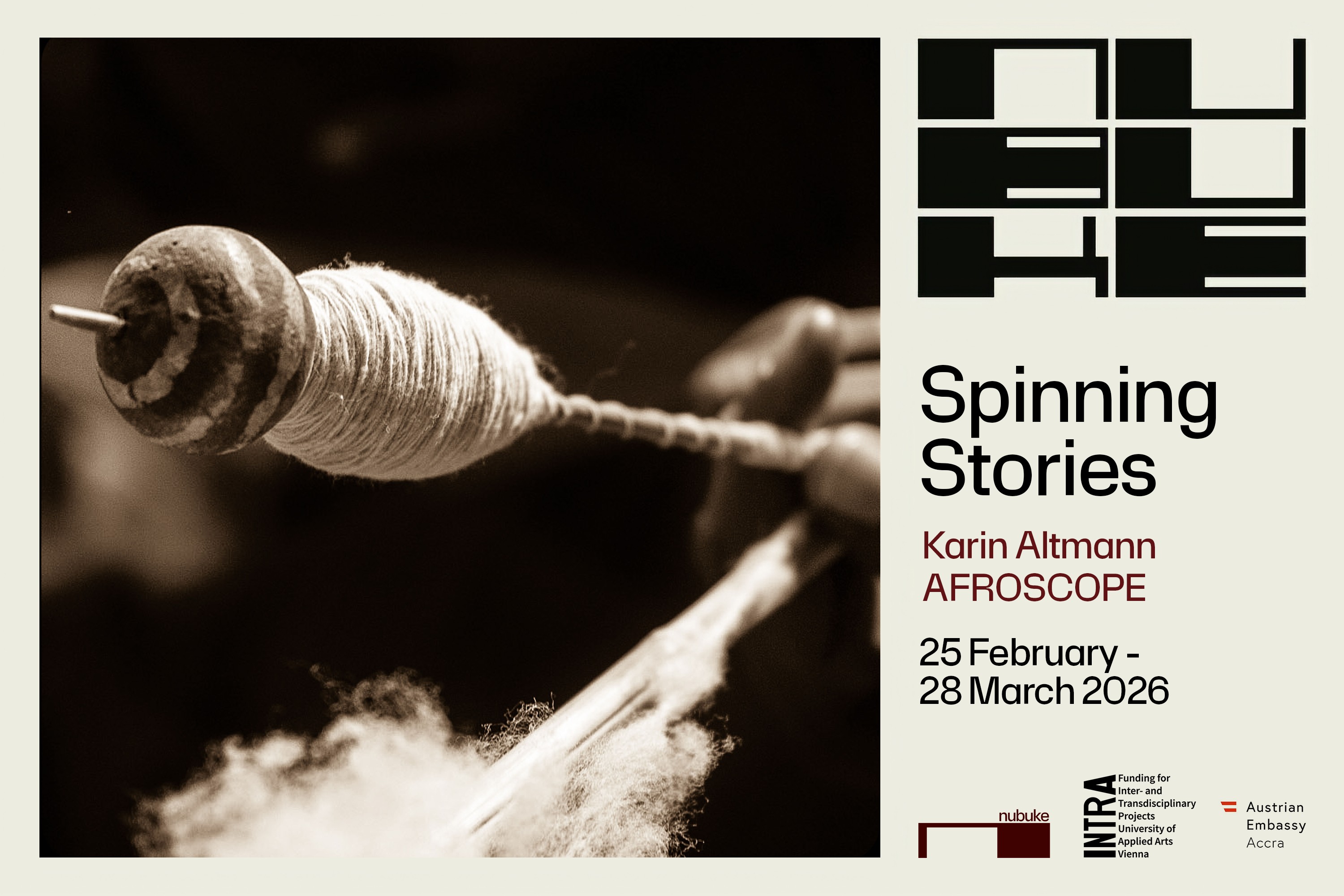 Gezeigt werden künstlerische und forschungsbasierte Arbeiten von Karin Altmann und Nana Opoku, die traditionelle Spinnpraktiken in Ghana und Österreich anhand von Lebensgeschichten von Frauen verbinden, mit dem Ziel eine transkulturelle Lerngemeinschaft zu schaffen, die traditionelles Handwerk und Wissen mit neuen Technologien verschränkt und nachhaltige Zukunftsvisionen für die Textilkunst entwirft. Dabei werden Archive nicht als abgeschlossene Speicher, sondern als Wissensräume begriffen, als lebendige, sich ständig wandelnde Gefüge, die relationale, performative und kollektive Praktiken und Prozesse vereinen. Erzählen fungiert dabei als Methode der Wissensproduktion, in der Erinnerungen, Lebensgeschichten und Materialitäten miteinander versponnen, verwoben und geteilt werden und auch über den Abschluss des Projekts hinaus in Bewegung bleiben.