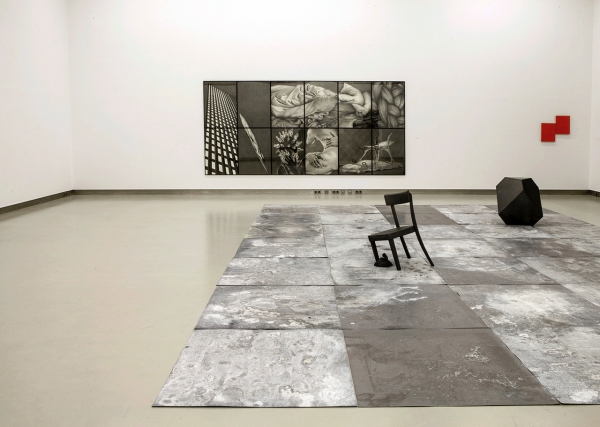 Seine Zeichnungsblöcke, Objekte, Installationen, Malereien und Filme sind komplex in ihrer Inhaltlichkeit, ihren Bezügen und Querverweisen auf (kunst-)historische sowie zeitgenössische politische, soziale und kulturelle Phänomene. Seit 1995 entstehen Tableaus aus großformatigen, einzeln gerahmten Kohlezeichnungen unter dem Titel »Museum der Schatten«. Durch die künstliche Rasterung des jeweiligen Tableaus wird deutlich, worum es ihm geht: Wölzl konstruiert seine eigenen Welten, indem er Motive aus verschiedenen Kontexten miteinander konfrontiert und damit neue Zusammenhänge schafft. Meist sind es Ausschnitte aus Kunstwerken, Filmen und Architekturen oder Fragmente von Körpern in einem nicht näher definierten Raum. Mehr oder weniger erkennt man dennoch die Motive und ursprünglichen Zusammenhänge. Einiges, obwohl nicht eindeutig erzählt, verweist auf soziale Brennpunktthemen: Charlie Chaplin in dem Film »Moderne Zeiten« auf den Maschinenterror, die Architektur des profitablen Investmentunternehmens »Black Rock« auf die kapitalistische Marktwirtschaft, die »Stock Tickers« auf die Macht der Börse, das Zitat der Klagemauer auf religiöse Brisanz.
