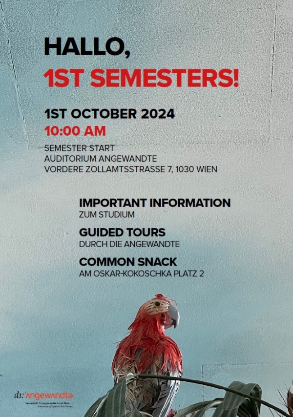 Das Wintersemester 2024 startet für alle Erstsemestrigen am 1. Oktober 2024 um 10:00 Uhr im Auditorium der Angewandten in Vordere Zollamtsstraße 7, 1030 Wien.