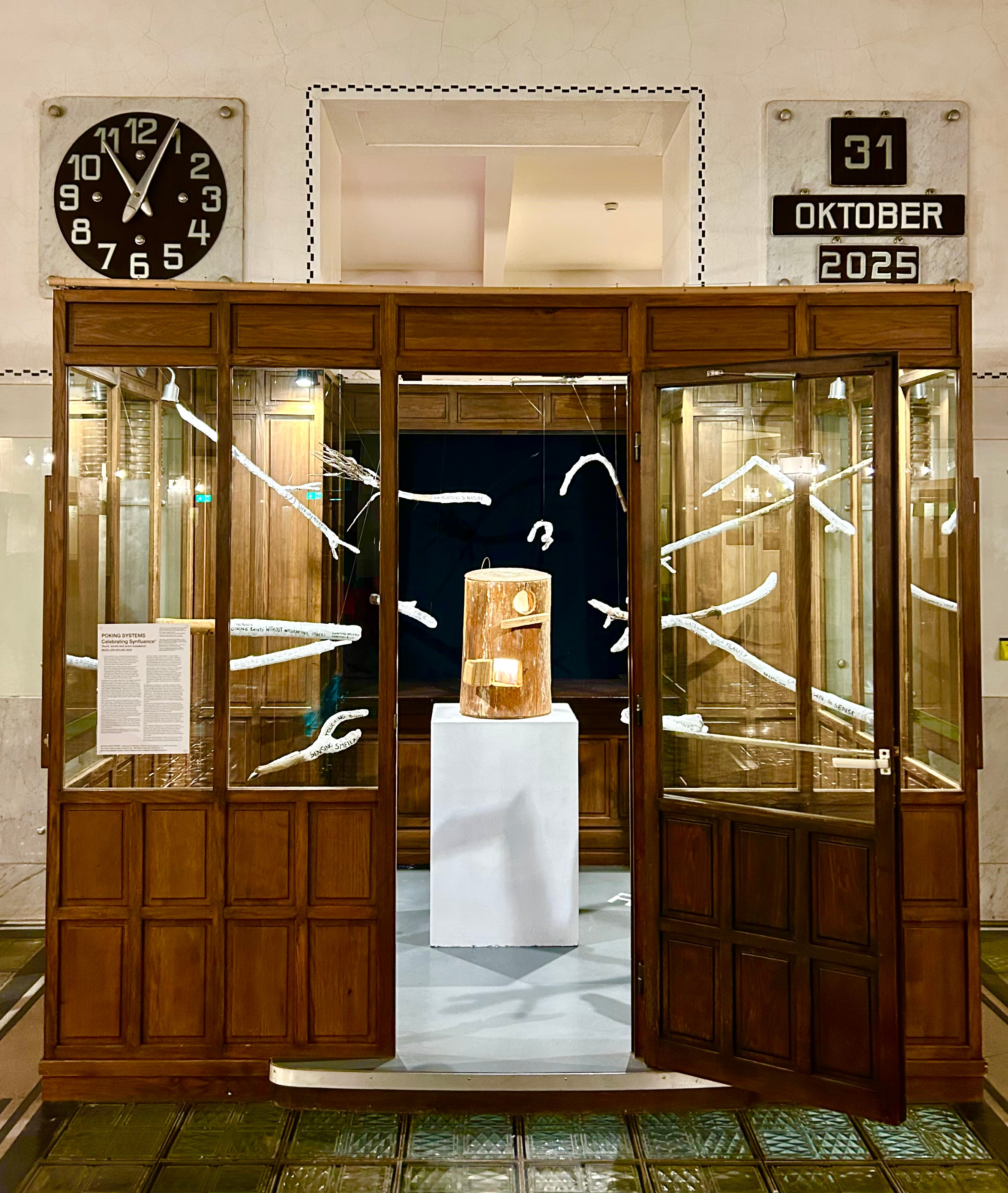 Since fall 2023 AIL is part of the research project SENSING LIVING SYSTEMS together with the artist duo MUELLER-DIVJAK. The Otto Wagner Cashier Hall offers a special opportunity to give insights to processes and activities of SENSING LIVING SYSTEMS. For the first time, the historical cabin in the hall is used for ongoing artistic installations to make methods more visible, relatable and comprehensible for a public audience. As the cabin is surrounded by a broad audience coming together in the cashier hall, it offers a chance to gather feedback and reactions to the project and the specific stages of studies that will be incorporated into the project outcome.